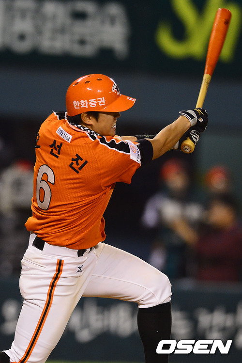 16일 오후 서울 잠실구장에서 열리는 2012 팔도 프로야구 두산 베어스와 한화 이글스의 경기 8회초 1사 1,2루 한화 오선진의 동점 적시타를 날리고 있다