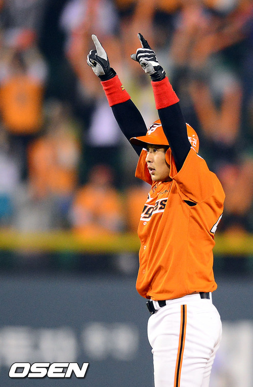 뒤를 이은 오선진. 악송구 두 개로 리드를 내줬던 오선진은 노경은의 공을 제대로 당겨 좌익수 방면 안타로 연결했다. 좌익수 김현수는 홈을 파고드는 최진행을 잡기 위해 송구했으나 포수 양의지가 송구를 받지 못하고 뒤로 흘렸다. 4-4 동점으로 이어진 순간이다.