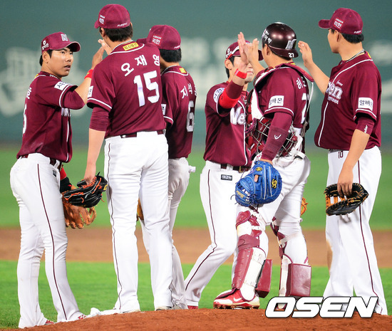 경기를 마치고 넥센 선수들이 마운드 근처에 모여서 하이파이브를 하고 있다. / rumi@osen.co.kr