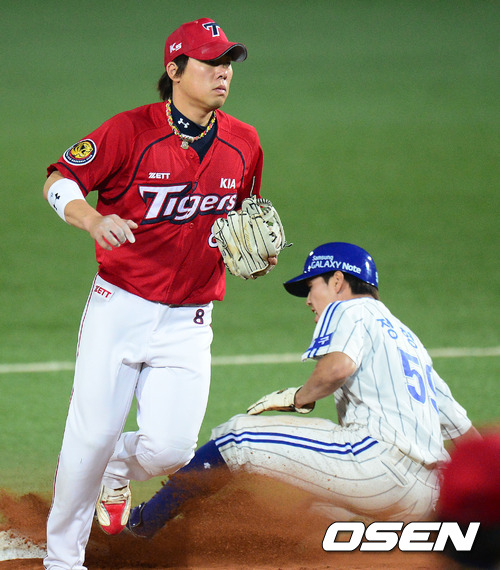 16일 오후 대구구장에서 열린 '2012 팔도 프로야구' 삼성 라이온즈와 KIA 타이거즈의 경기, 7회말 2사 1,3루에서 KIA 안치홍이 삼성 김상수의 내야땅볼에 2루주자 정형식을 포스아웃 처리하고 있다.
