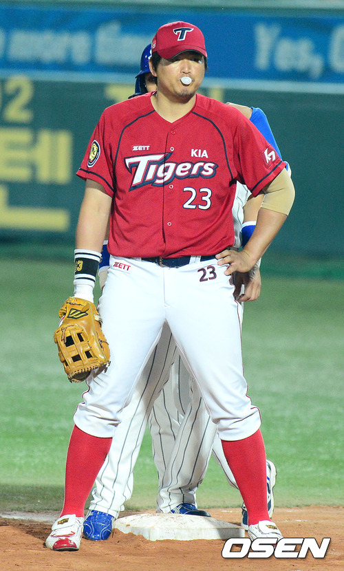 16일 오후 대구구장에서 열린 '2012 팔도 프로야구' 삼성 라이온즈와 KIA 타이거즈의 경기, 8회말 2사에서 좌전안타를 날린 삼성 이승엽이 김태균 코치와 KIA 최희섭 뒤에서 이야기를 나누고 있다.
