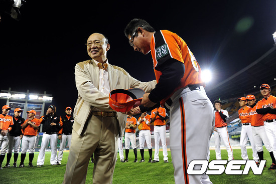 경기종료 후 한화 김승연 회장이 한대화 감독과 악수를 나누고 있다. /soul1014@osen.co.kr
