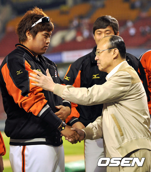 경기종료 후 한화 김승연 회장이 류현진과 악수를 나누고 있다. /soul1014@osen.co.kr