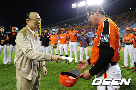 경기종료 후 한화 김승연 회장이 한대화 감독에게 금일봉을 전달하고 있다. /soul1014@osen.co.kr