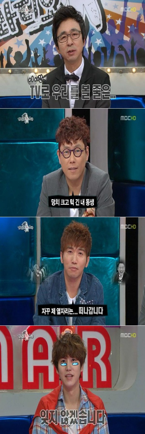 이어 윤종신은 "덩치 크고 턱긴 내 동생. 아침 먹고 점심 먹고 저녁 먹고 야식을 먹어도 시간이 남을 것"이라고 말했고, 윤종신은 "나는 이별의 아이콘인가? 자꾸 내 옆자리는 떠나간다. 이제 내 옆자리에는 윤종신이 있다"고 말해 웃음을 자아냈다.