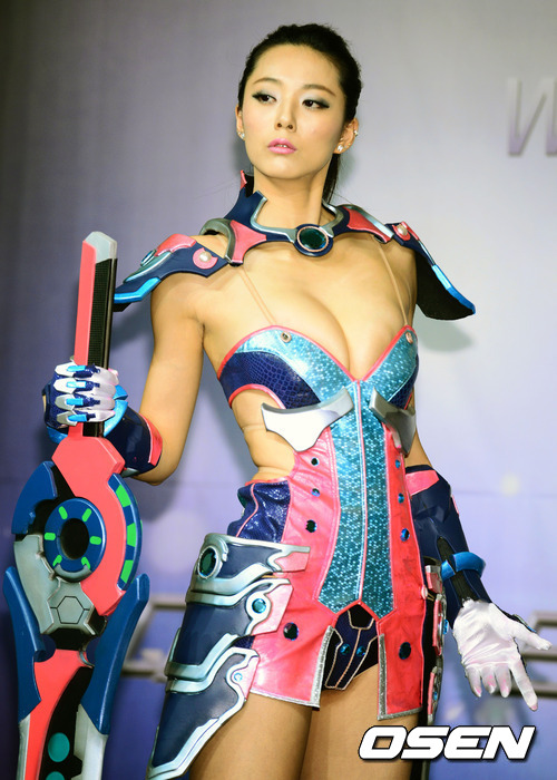17일 오전 역삼동 아모리스홀에서 진행된 온라인게임 '퀸스블레이드' 홍보모델을 선보이는 '퀸스블레이드 위드 아이샹젠'행사에서 아이샹젠이 게임 의상을 입고 포토타임을 갖고 있다.