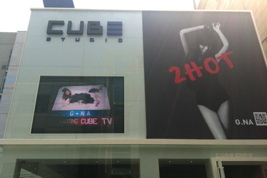 17일 청담동의 큐브 엔터테인먼트가 운영하는 스튜디오 1층 큐브카페에는 지나의 세 번째 미니앨범 재킷 이미지와 QR코드가 삽입된 대형 현수막이 걸렸다.