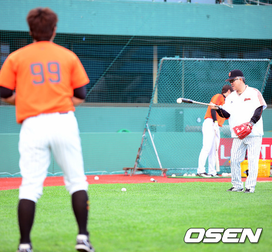 17일 오후 사직구장에서 '2012 팔도 프로야구' 롯데 자이언츠와 넥센 히어로즈와의 경기가 열릴 예정인 가운데 훈련시간에 롯데 양승호 감독이 강민호에게 배트로 볼을 쳐주며 수비훈련을 시키고 있다.