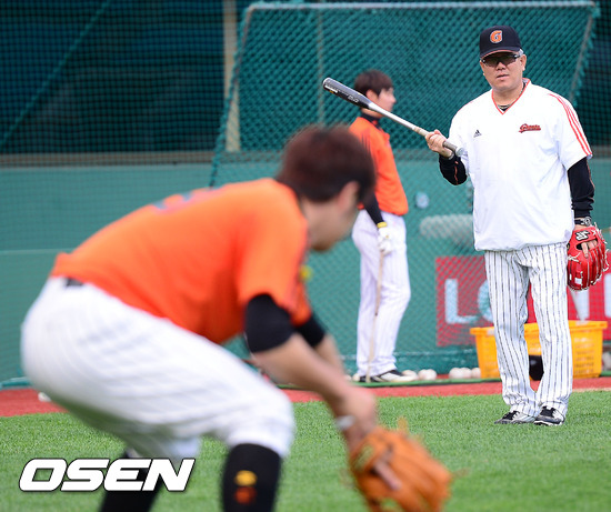 17일 오후 사직구장에서 '2012 팔도 프로야구' 롯데 자이언츠와 넥센 히어로즈와의 경기가 열릴 예정인 가운데 훈련시간에 롯데 양승호 감독이 강민호에게 배트로 볼을 쳐주며 수비훈련을 시키고 있다.