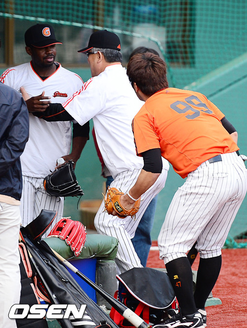 17일 오후 사직구장에서 '2012 팔도 프로야구' 롯데 자이언츠와 넥센 히어로즈와의 경기가 열릴 예정인 가운데 훈련시간에 롯데 양승호 감독이 강민호에게 배트로 볼을 쳐주며 수비훈련을 시킬 때 유먼도 나와 훈련을 받고자 하자 양승호 감독이 유먼을 말리고 있다.