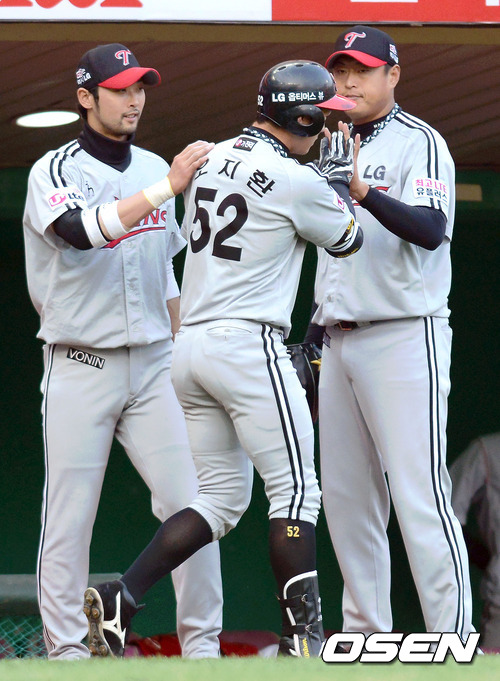 17일 오후 인천 문학야구장에서 열린 '2012 팔도 프로야구' SK 와이번스와 LG 트윈스의 경기 3회초 2사 LG 오지환이 솔로 홈런을 치고 정재복, 서동욱에게 축하를 받고 있다.