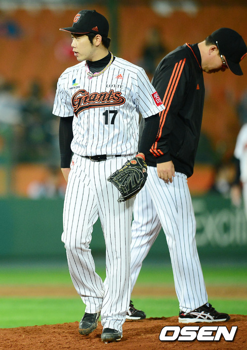 17일 오후 사직구장에서 열린 '2012 팔도 프로야구' 롯데 자이언츠와 넥센 히어로즈와의 경기에서 5회초 2사 주자 1,2루 서건창 타석에서 롯데 선발 고원준이 강판당하고 있다.