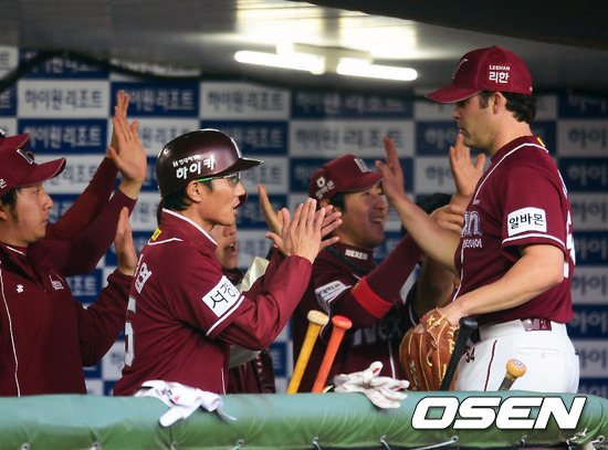 17일 오후 사직구장에서 열린 '2012 팔도 프로야구' 롯데 자이언츠와 넥센 히어로즈와의 경기에서 4회를 마치고 덕아웃에서 넥센 선발 나이트가 동료들과 하이파이브를 하고 있다.