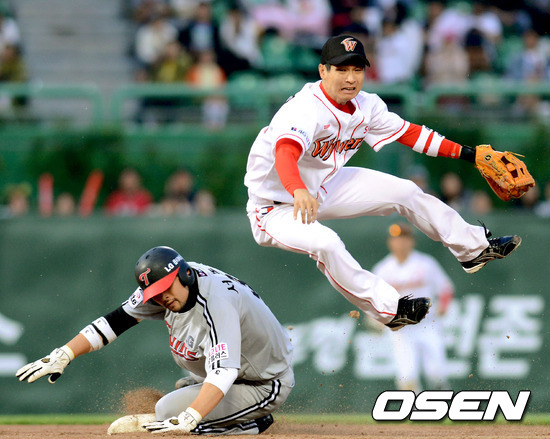 17일 오후 인천 문학야구장에서 열린 '2012 팔도 프로야구' SK 와이번스와 LG 트윈스의 경기 5회초 1사 1루 SK 최윤석이 LG 김태군의 타구를 병살 처리하고 있다.
