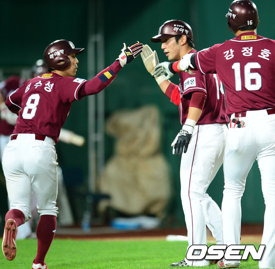 17일 오후 사직구장에서 열린 '2012 팔도 프로야구' 롯데 자이언츠와 넥센 히어로즈와의 경기에서 5회초 1사 주자 만루 넥센 박병호의 좌익수 왼쪽 2타점 적시타때 홈을 밟은 정수성 서건창이 하이파이브를 하고 있다.