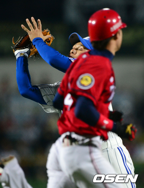 17일 오후 대구구장에서 열린 '2012 팔도 프로야구' 삼성 라이온즈와 KIA 타이거즈의 경기, 3회초 2사 2,3루에서 삼성 이승엽이 KIA 이준호의 내야 플라이 타구를 잡으며 조명탑을 바라보고 있다.