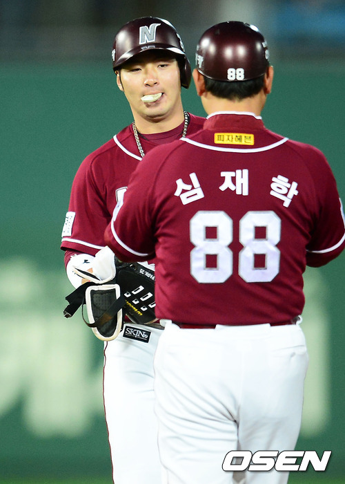 17일 오후 사직구장에서 열린 '2012 팔도 프로야구' 롯데 자이언츠와 넥센 히어로즈와의 경기에서 5회초 1사 주자 만루 넥센 박병호가 좌익수 왼쪽 2타점 적시타를 날린 후 2루에서 심재학 코치와 하이파이브를 하고 있다.