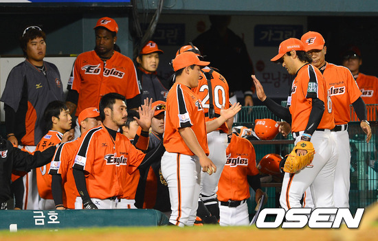 17일 오후 서울 잠실야구장에서 열린 '2012 팔도 프로야구' 두산 베어스와 한화 이글스의 경기, 4회말 2사 3루 한화 박찬호가 두산 임재철을 외야플라이로 처리하고 더그아웃에서 동료들의 축하를 받고 있다.