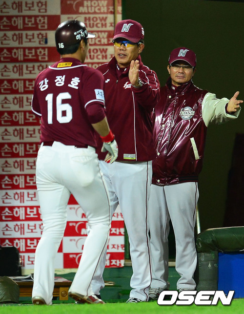 17일 오후 사직구장에서 열린 '2012 팔도 프로야구' 롯데 자이언츠와 넥센 히어로즈와의 경기에서 5회초 2사 주자 2,3루 넥센 김민우의 좌중간 2타점 적시타때 홈을 밟은 강정호가 덕아웃에서 김시진 감독과 하이파이브를 하고 있다.