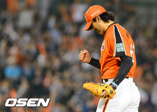 17일 오후 서울 잠실야구장에서 열린 '2012 팔도 프로야구' 두산 베어스와 한화 이글스의 경기, 5회말 1사 3루 한화 박찬호가 두산 손시헌을 삼진으로 처리하고 환호하고 있다.