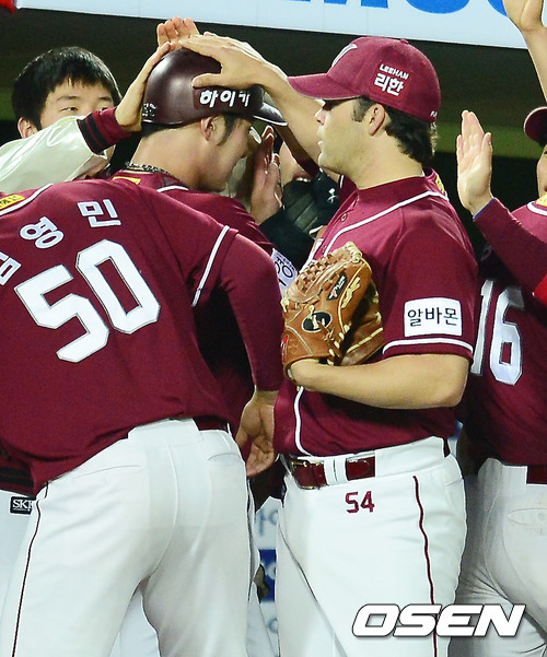 17일 오후 사직구장에서 열린 '2012 팔도 프로야구' 롯데 자이언츠와 넥센 히어로즈와의 경기에서 5회초 2사 주자 2,3루 넥센 김민우의 좌중간 2타점 적시타때 홈을 밟은 박병호를 덕아웃에서 넥센 선발 나이트가 박병호의 헬멧을 치고 있다.