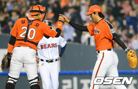 17일 오후 서울 잠실야구장에서 열린 '2012 팔도 프로야구' 두산 베어스와 한화 이글스의 경기, 5회말 2사 3루 한화 박찬호가 임재철을 외야플라이로 처리하고 포수 정범모와 하이파이브를 하고 있다.