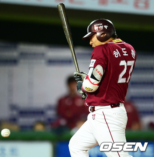 17일 오후 사직구장에서 열린 '2012 팔도 프로야구' 롯데 자이언츠와 넥센 히어로즈와의 경기에서 5회초 2사 주자 2루 넥센 허도환이 타석에서 몸에 볼을 맞고 있다.