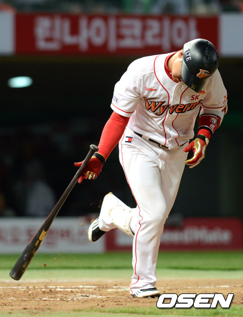 17일 오후 인천 문학야구장에서 열린 '2012 팔도 프로야구' SK 와이번스와 LG 트윈스의 경기 7회말 SK 최정이 내야 플라이를 치고 아쉬워하고 있다.