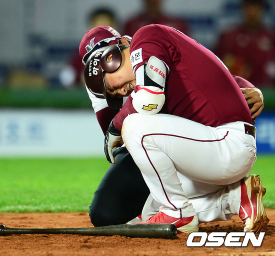 17일 오후 사직구장에서 열린 '2012 팔도 프로야구' 롯데 자이언츠와 넥센 히어로즈와의 경기에서 5회초 2사 주자 2루 넥센 허도환이 타석에서 몸에 볼을 맞고 고통스러워 하고 있다.