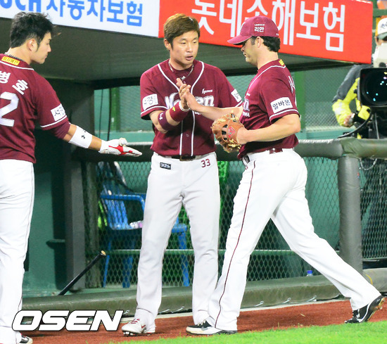 17일 오후 사직구장에서 열린 '2012 팔도 프로야구' 롯데 자이언츠와 넥센 히어로즈와의 경기에서 7회말 2사 주자 1,3루 롯데 황재균 타석에서 넥센 선발 나이트가 마운드를 내려가 덕아웃에서 동료들과 하이파이브를 하고 있다.