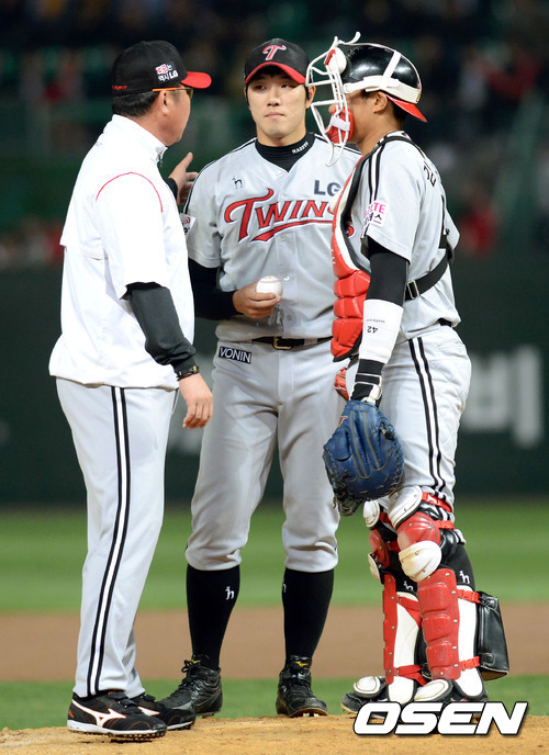17일 오후 인천 문학야구장에서 열린 '2012 팔도 프로야구' SK 와이번스와 LG 트윈스의 경기 7회말 2사 LG 차명석 코치가 마운드에서 유원상을 격려하고 있다.