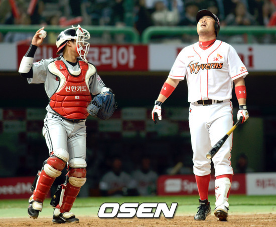 17일 오후 인천 문학야구장에서 열린 '2012 팔도 프로야구' SK 와이번스와 LG 트윈스의 경기 8회말 SK 이호준이 삼진을 당하고 아쉬워하고 있다.