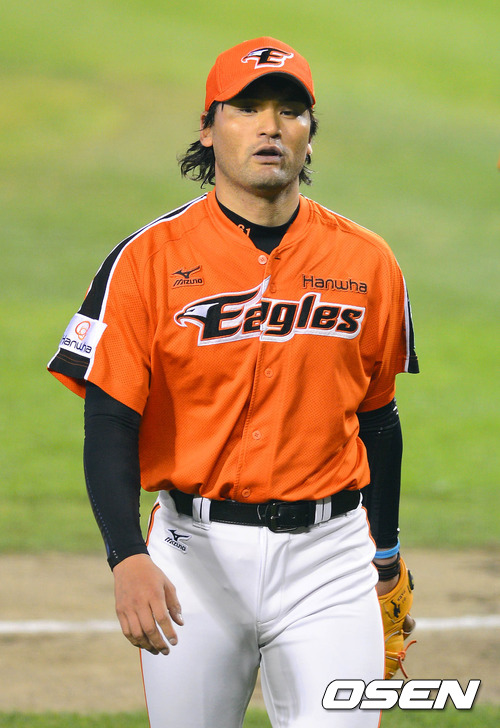 17일 오후 서울 잠실야구장에서 열린 '2012 팔도 프로야구' 두산 베어스와 한화 이글스의 경기, 7회말 2사 한화 박찬호가 두산 양의지를 삼진으로 처리하고 더그아웃으로 가고 있다.