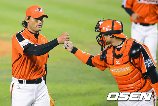 17일 오후 서울 잠실야구장에서 열린 '2012 팔도 프로야구' 두산 베어스와 한화 이글스의 경기, 7회말 2사 한화 박찬호가 두산 양의지를 삼진으로 처리하고 포수 정범모와 하이파이브를 하며 더그아웃으로 가고 있다.