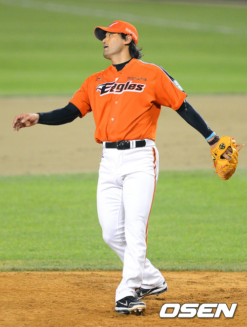 17일 오후 서울 잠실야구장에서 열린 '2012 팔도 프로야구' 두산 베어스와 한화 이글스의 경기, 7회말 2사 한화 박찬호가 두산 양의지에게 볼을 던지고 아쉬워하고 있다.