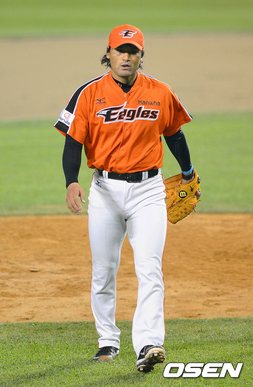 17일 오후 서울 잠실야구장에서 열린 '2012 팔도 프로야구' 두산 베어스와 한화 이글스의 경기, 7회말 2사 한화 박찬호가 두산 양의지를 삼진으로 처리하고 더그아웃으로 가고 있다.