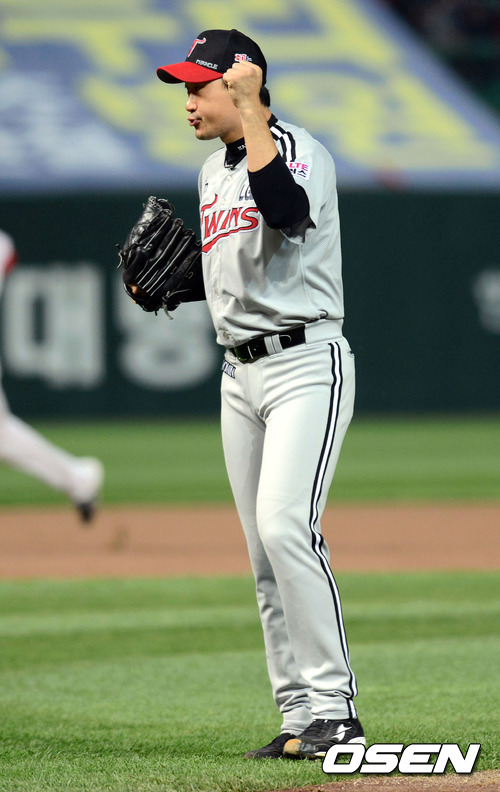 9회말 2사 1,2루 LG 봉중근이 SK 최정을 플라이 아웃으로 잡아내고 기뻐하고 있다. / youngrae@osen.co.kr