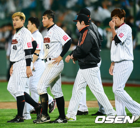 경기를 마치고 롯데 선수들이 어두운 표정으로 그라운드로 나오고 있다. / rumi@osen.co.kr