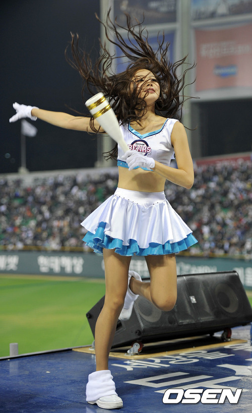 17일 오후 서울 잠실야구장에서 열린 '2012 팔도 프로야구' 두산 베어스와 한화 이글스의 경기, 두산 치어리더가 화려한 공연을 펼치고 있다.