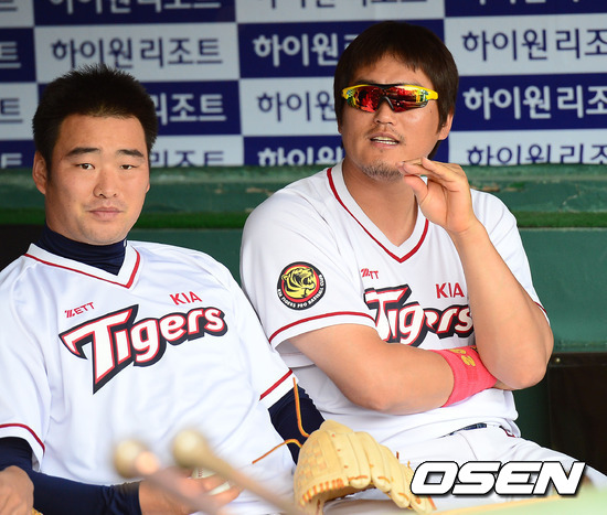 18일 오후 사직구장에서 '2012 팔도 프로야구' 롯데 자이언츠와 KIA 타이거즈 경기가 열릴 예정인 가운데 양팀의 훈련시간에 KIA 최희섭이 덕아웃에서 사인을 보내고 있다.