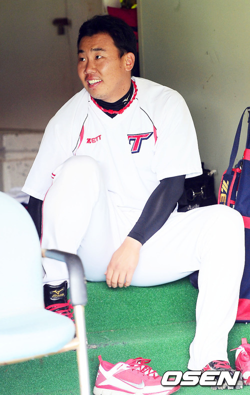 18일 오후 사직구장에서 '2012 팔도 프로야구' 롯데 자이언츠와 KIA 타이거즈 경기가 열릴 예정인 가운데 양팀의 훈련시간에 KIA 이범호가 스파이크를 신고 있다.
