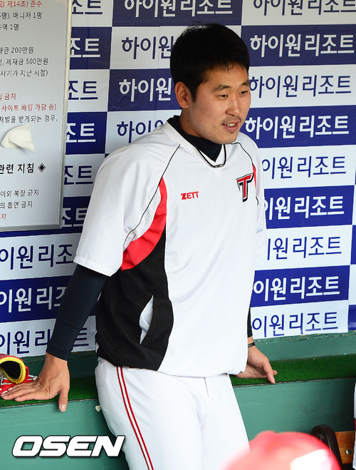 18일 오후 사직구장에서 '2012 팔도 프로야구' 롯데 자이언츠와 KIA 타이거즈 경기가 열릴 예정인 가운데 양팀의 훈련시간에 KIA 윤석민이 밝은 표정으로 덕아웃에서 얘기를 나누고 있다.