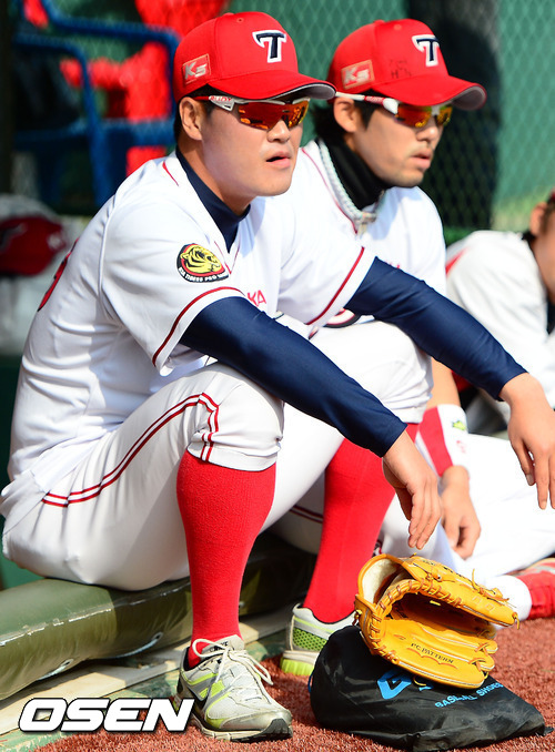 18일 오후 사직구장에서 '2012 팔도 프로야구' 롯데 자이언츠와 KIA 타이거즈 경기가 열릴 예정인 가운데 양팀의 훈련시간에 KIA 유동훈과 이용규가 휴식을 취하고 있다.