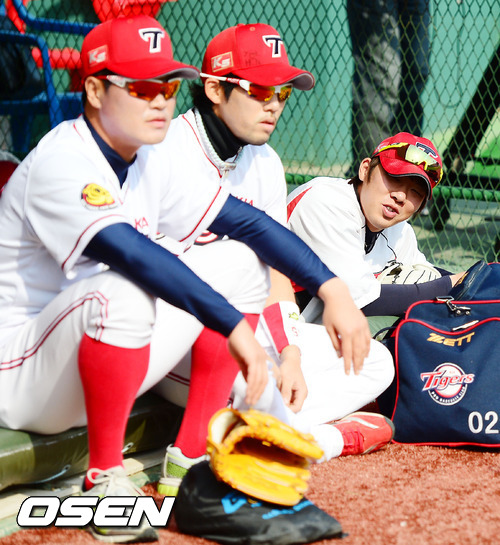 18일 오후 사직구장에서 '2012 팔도 프로야구' 롯데 자이언츠와 KIA 타이거즈 경기가 열릴 예정인 가운데 양팀의 훈련시간에 KIA 유동훈과 이용규가 휴식을 취할때 안치홍이 말을 걸고 있다.