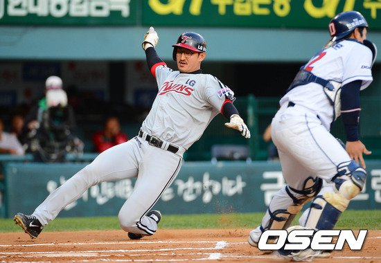 18일 오후 서울 잠실야구장에서 열린 '2012 팔도 프로야구' 두산 베어스와 LG 트윈스의 경기, 1회초 무사 1,2루 LG 이진영의 선제 좌전 1타점 적시타때 2루주자 박용택이 홈으로 슬라이딩을 하고 있다.