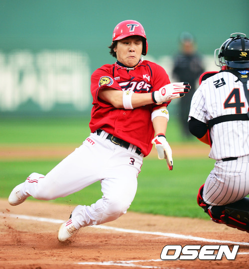 18일 오후 사직구장에서 열린 '2012 팔도 프로야구' 롯데 자이언츠와 KIA 타이거즈 경기에서 1회초 2사 주자 1루 KIA 최희섭의 중견수 뒤 선취 1타점 적시타때 1루 주자 김선빈이 홈으로 몸을 날리며 세이프되고 있다.