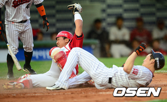 18일 오후 사직구장에서 열린 '2012 팔도 프로야구' 롯데 자이언츠와 KIA 타이거즈 경기 2회말 2사 주자 1,3루 1루 롯데 김사훈 타석에서 주자 박준서와 3루 주자 박종윤이 더블 스틸을 시도, 박종윤이 홈에서 세이프 됐지만 KIA 김상훈이 아웃이라고 주장하고 있다.