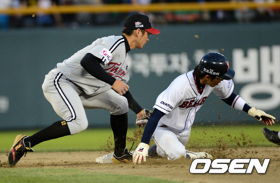 18일 오후 서울 잠실야구장에서 열린 '2012 팔도 프로야구' 두산 베어스와 LG 트윈스의 경기, 4회초 1사 1루 두산 정수빈 타석때 1루주자 허경민이 도루를 실패하고 있다.