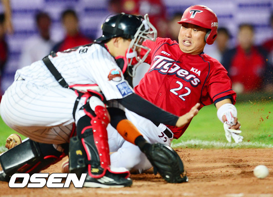18일 오후 사직구장에서 열린 '2012 팔도 프로야구' 롯데 자이언츠와 KIA 타이거즈 경기에서 5회초 2사 주자 1루 KIA 이준호의 중견수 뒤 1타점 적시타때 1루 주자 김상훈이 홈으로 몸을 날리며 세이프되고 있다.