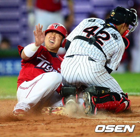 18일 오후 사직구장에서 열린 '2012 팔도 프로야구' 롯데 자이언츠와 KIA 타이거즈 경기에서 5회초 2사 주자 1루 KIA 이준호의 중견수 뒤 1타점 적시타때 1루 주자 김상훈이 홈으로 몸을 날리며 세이프되고 있다.